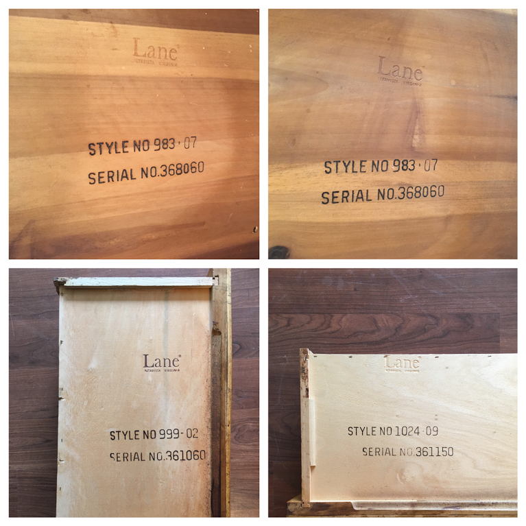 "The Scandinavian influence is unmistakeable in this lightly scaled walnut collection that gives the illusion of tops suspended inches above the legs. Legs and stretchers are sculptured in the Danish fashion and the edges of the tops are feathered out in a thin, upswept contour. Sides are gently bowed in keeping with the sculptured character of the design. Impressively figured American Walnut in the tops is accented with borders and rubbed to Lane's handsome gunstock finish. Drawer fronts are panelled with woven cane." -From the original 1962 catalog