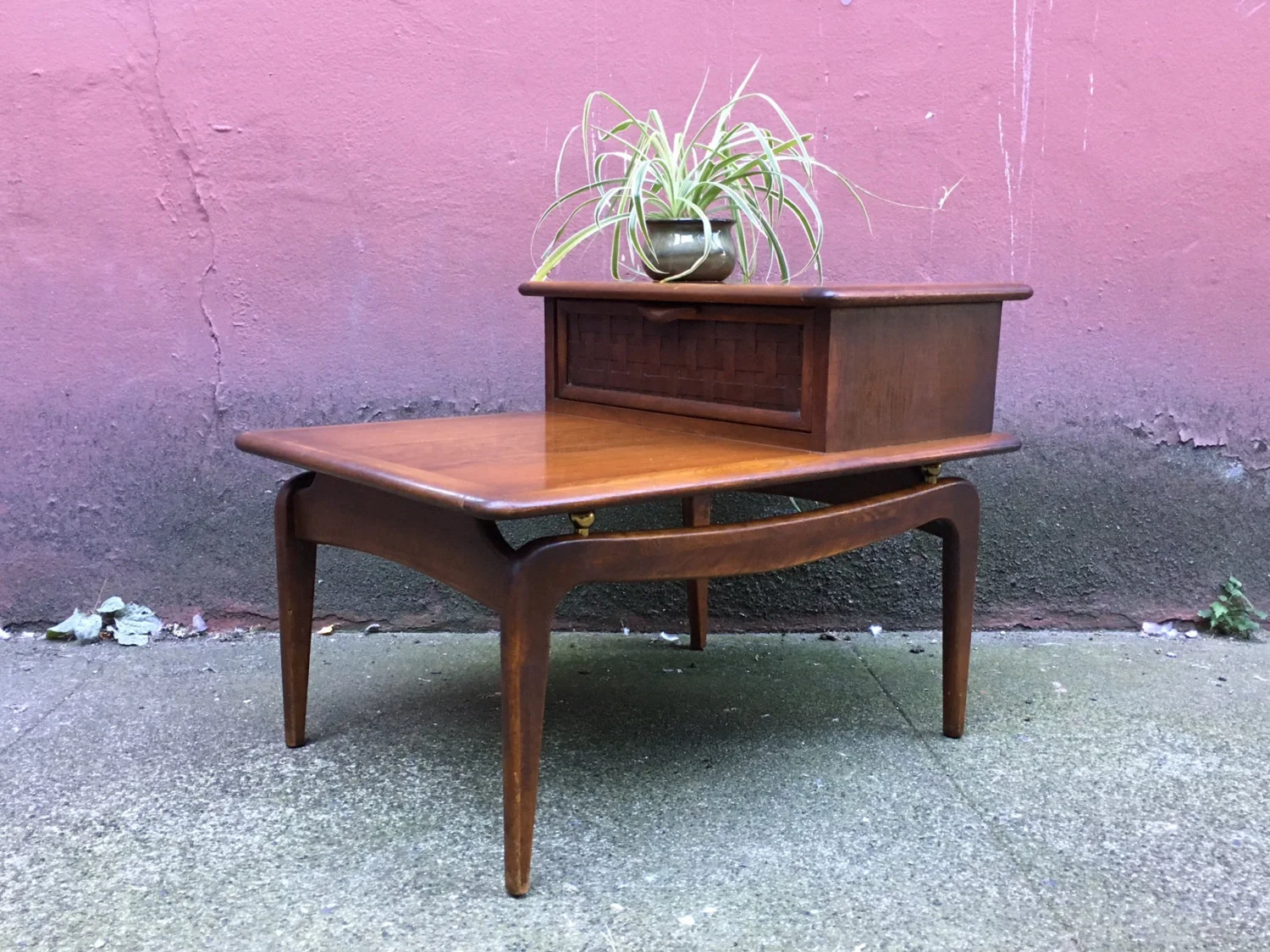"The "sculpture in wood" look reaches its ultimate refinement in this beautifully executed Scandinavian collection. Tops display huge, undisturbed expanses of rich gunstock Walnut with boardered edges that taper smoothly into softly rounded contours. All legs have the same softly sculptured quality, with not a single sharp edge or corner visible anywhere. A unique accent on drawer and door fronts is achieved with wovenwood, a genuine weave of actual walnut strips in an interesting textured pattern." -From the original 1962 catalog